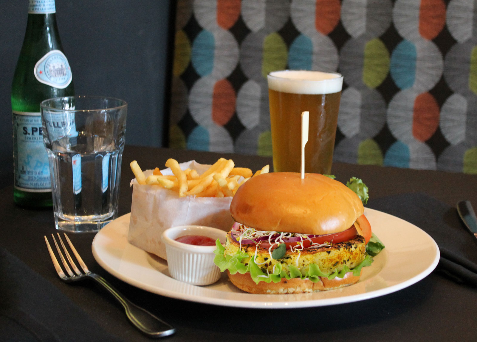 Tavern’s original recipe, house-made veggie burger, vegan feta, arugula, sweet potato fries